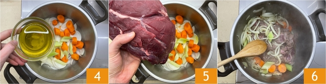 Geben Sie das Gemüse in einen Schnellkochtopf, dann gießen Sie das Öl 4 ein und legen das Rindfleischstück hinein 5. Stellen Sie den Topf auf den Herd und lassen Sie es einige Minuten schmoren 6.
