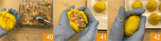 Nehmen Sie etwa 40 g Füllung 40 und geben diese in die Mulde 41, dann schließen Sie es mit Reis und formen das Arancino oval 42. Fahren Sie auf diese Weise fort, um alle Arancini zu formen; mit diesen Mengen erhalten Sie etwa 20 Stück.