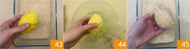 Nun fahren Sie mit der doppelten Panade fort: zuerst mit den Semmelbröseln 43, dann mit dem Eiweiß (das Sie zuvor mit einer Gabel geschlagen haben) 44 und schließlich erneut mit den Semmelbröseln 45.