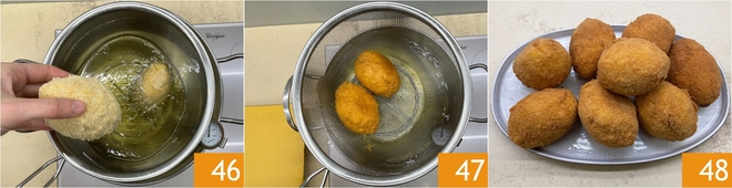 Sie sind bereit zum Frittieren: Erhitzen Sie das Pflanzenöl auf 160°, dann tauchen Sie wenige Stücke gleichzeitig ein 46 und frittieren für 7 Minuten. Wenn sie gleichmäßig goldbraun sind, heben Sie die Arancini heraus 47 und legen sie auf Läuferpapier. Genießen Sie die Arancini mit Fleisch und Béchamel noch heiß 48!