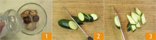 Um die Reisgnocchi mit Gemüse zuzubereiten, bedecken Sie zuerst die getrockneten Pilze mit lauwarmem Wasser 1 und lassen Sie sie etwa 20 Minuten einweichen. Bereiten Sie in der Zwischenzeit das restliche Gemüse vor: Schneiden Sie die Zucchini schräg in eher dicke Scheiben 2 und dann in dünnere Scheiben 3.