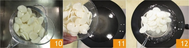 Spülen Sie die Reisgnocchi unter fließendem Wasser ab 10. In der Zwischenzeit bringen Sie Wasser in einem Wok zum Kochen, geben Sie dann einen Spritzer Öl hinzu, um zu verhindern, dass sie aneinander kleben. Kochen Sie die Gnocchi im kochenden Wasser 11 und gießen Sie sie nach einer Minute ab 12.