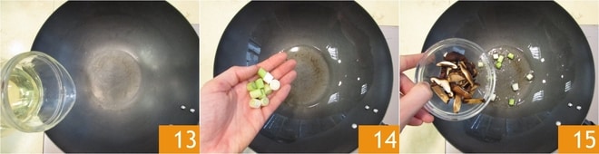 Erhitzen Sie im selben Wok einen Schuss Öl 13 und braten Sie den weißen Teil der Frühlingszwiebel eine Minute lang an 14, fügen Sie dann die abgetropften Pilze hinzu 15.