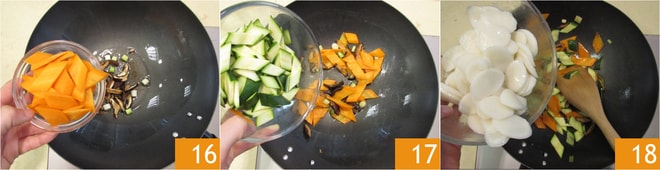Fügen Sie auch die Karotten hinzu 16 und braten Sie für eine weitere Minute. Fügen Sie die Zucchini hinzu 17 und braten Sie für 2-3 Minuten. Zum Schluss die Gnocchi hinzufügen 18.