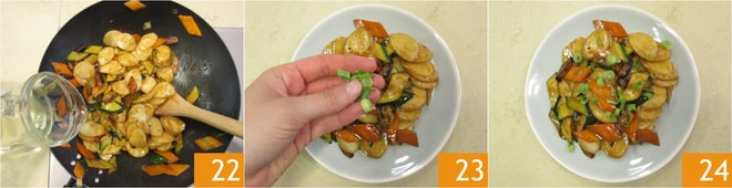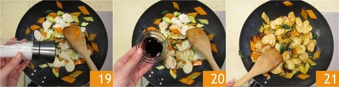 Mit Salz 19 und Pfeffer würzen, dann mit heller und dunkler Sojasauce abschmecken 20. Alles kurz verrühren und anbraten 21.
