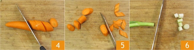 Verfahren Sie genauso mit den Karotten: Nachdem Sie sie geschält haben, schneiden Sie sie zuerst in Scheiben 4 und dann in dünnere Scheiben 5. Schneiden Sie auch den weißen Teil der Frühlingszwiebeln in Scheiben 6.