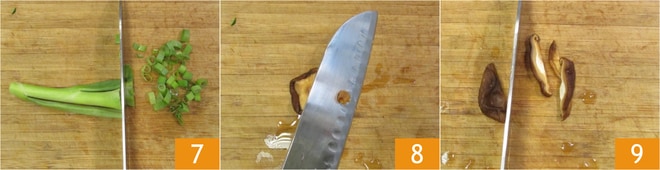 Schneiden Sie den Stiel der Frühlingszwiebel 7 dünn. Schließlich die Pilze abgießen, den Stiel entfernen 8 und den oberen Teil in Streifen schneiden 9.