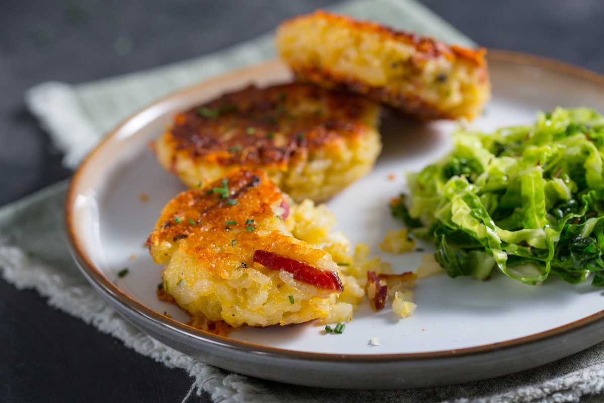 Sobald sie auf einer Seite angebraten sind, drehen Sie sie auf die andere Seite 16 17. Richten Sie die Reisknödel mit fein geschnittenem und mit Öl, Essig, Salz, Pfeffer und Kümmel gewürztem Wirsing an 18! Sie können nach Belieben mit weiterem Schnittlauch aromatisieren.