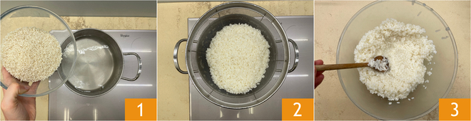 Um die Reisknödel zuzubereiten, beginnen Sie, den Reis in einem Topf mit reichlich gesalzenem Wasser nach Belieben etwa 12 Minuten lang zu kochen 1. Nach dieser Zeit den Reis abgießen 2 und in einer Schüssel im Kühlschrank abkühlen lassen 3; Sie können mit Frischhaltefolie abdecken.