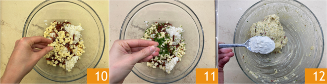 Mit einer Prise Salz 10, Schnittlauch und Pfeffer 11 würzen. Mischen, dann das Mehl hinzufügen (Sie können die Konsistenz regulieren, indem Sie wenig auf einmal hinzufügen, um zu sehen, ob die gesamte angegebene Menge benötigt wird) 12.