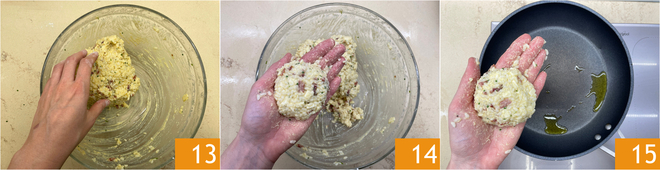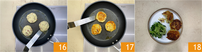 Teigen, bis die Mischung kompakt ist 13. Machen Sie Medaillons von etwa 90 g jeweils 14 und braten Sie sie bei mittlerer Hitze in einer beschichteten Pfanne mit etwas Öl an 15.