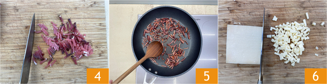 In der Zwischenzeit den Speck in dünne Stücke schneiden 4 und in einer beschichteten Pfanne ohne Zugabe von Fett anbraten 5. Den Käse ebenfalls in sehr kleine Würfel schneiden 6.