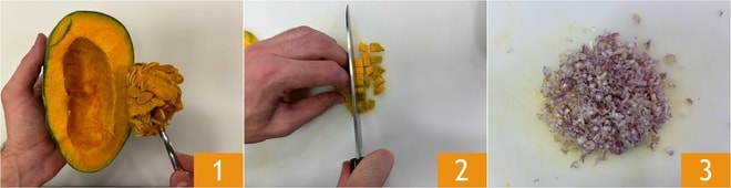 Um die Reiskroketten mit Kürbis und Stracchino zuzubereiten, entfernen Sie zuerst die Kerne und die Schale des Kürbisses 1, dann schneiden Sie ihn in Würfel von einem halben cm 2. Schälen und hacken Sie die Schalotte 3.