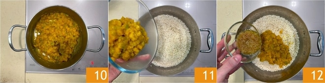 Wenn der Kürbis weich ist 10, geben Sie ihn in den gekochten und abgetropften Reis 11, dann fügen Sie auch die Schalotten hinzu 12 und würzen Sie mit Majoran.