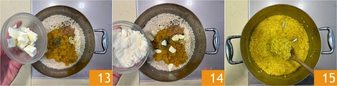 Mit Butter 13 und geriebenem Parmigiano Reggiano DOP 14 verfeinern. Mischen Sie alles gut 15.