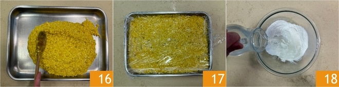 Verteilen Sie den Reis auf einem großen Blech 16 und lassen Sie ihn abkühlen, dann mit Frischhaltefolie abdecken 17 und für etwa eine Stunde in den Kühlschrank stellen, um fest zu werden. Jetzt bereiten Sie den Teig vor: Geben Sie das Mehl und das Wasser in eine Schüssel 18.