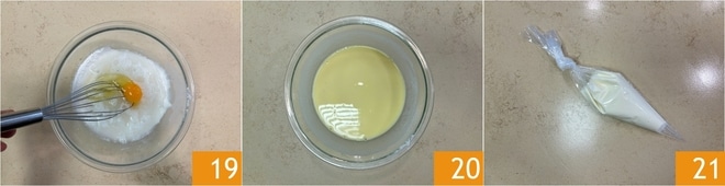 Fügen Sie eine Prise Salz und das Ei hinzu und mischen Sie dann mit einem Schneebesen 19, um einen glatten Teig ohne Klumpen zu erhalten 20. Übertragen Sie den Stracchino in einen Spritzbeutel 21.