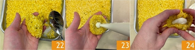 Nehmen Sie den Reis aus dem Kühlschrank, nehmen Sie einen Löffel 22 und drücken Sie ihn flach, um eine Scheibe zu formen, und drücken Sie einen Klecks Stracchino in die Mitte 23. Schließen Sie die Scheibe, indem Sie den Käse mit dem Reis umhüllen 24.