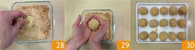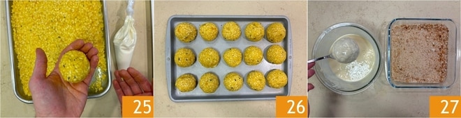 Formen Sie eine Kugel 25 und legen Sie sie auf ein Tablett 26. Fahren Sie auf diese Weise fort, bis die Zutaten aufgebraucht sind. Jetzt tauchen Sie die Kroketten in den Teig 27.