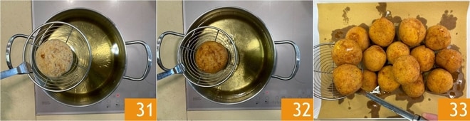 Frittieren Sie sie in heißem Pflanzenöl bei 180° 31, wobei Sie darauf achten, nur wenige Stücke gleichzeitig zu tauchen, um die Öltemperatur nicht zu senken. Wenn sie goldbraun sind, abtropfen lassen 32 auf Küchenpapier 33, salzen und servieren Sie Ihre heißen Reiskroketten mit Kürbis und Stracchino!