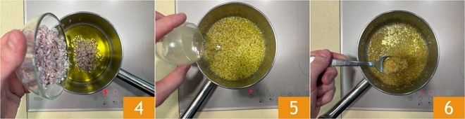 Erhitzen Sie einen Schuss Olivenöl in einem Topf, geben Sie das gehackte Schalotten 4 hinzu und lassen Sie es etwa 10 Minuten bei mittlerer bis niedriger Hitze im Öl dünsten. An diesem Punkt mit Weißwein ablöschen 5, den Alkohol verdampfen lassen und 5 Minuten bei niedriger Hitze kochen. Wenn es fertig ist, stellen Sie das Sofrito beiseite 6.