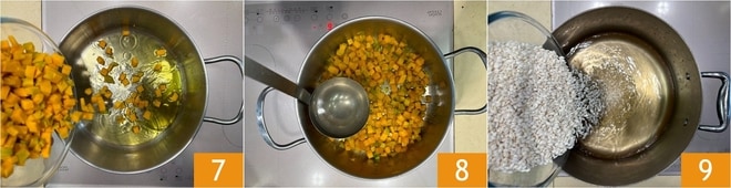 In einem Topf erhitzen Sie einen weiteren Schuss Öl, geben Sie die Kürbiswürfel 7 hinzu und braten Sie sie kurz an, dann salzen, pfeffern und 15 Minuten kochen, indem Sie etwa 200 g Gemüsebrühe hinzufügen 8. In der Zwischenzeit den Reis in 700 g Gemüsebrühe 12 Minuten kochen 9.