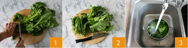 Um den Reiskuchen mit Stängelkohl und Salamella zuzubereiten, beginnen Sie als Erstes mit der Reinigung des Stängelkohls. Entfernen Sie mit einem Messer den äußersten, härtesten Teil 1. Dann teilen Sie die Blätter in zwei Teile 2 und waschen sie unter fließendem Wasser 3.