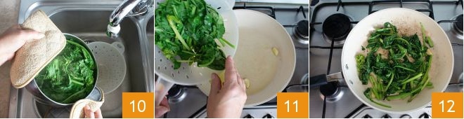 Gießen Sie nun den Stängelkohl ab 10 und braten Sie ihn kurz in einer Pfanne mit Knoblauch und Öl an 11 für wenige Momente 12.
