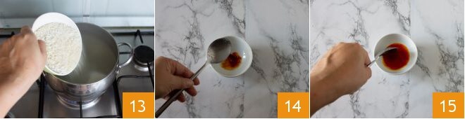 Kochen Sie den Reis in kochendem Salzwasser 13. In der Zwischenzeit geben Sie den Safran in eine Schüssel, fügen Sie ein paar Esslöffel Reiswasser hinzu 14 und rühren Sie um, um ihn aufzulösen 15.