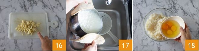 Schneiden Sie auch die Fontina in Würfelchen und legen Sie sie beiseite 16. Wenn der Reis gekocht ist (Sie können die Anweisungen auf der Verpackung befolgen), gießen Sie ihn ab 17 und geben ihn in eine Schüssel. Lassen Sie ihn abkühlen, dann fügen Sie die Eier hinzu 18,