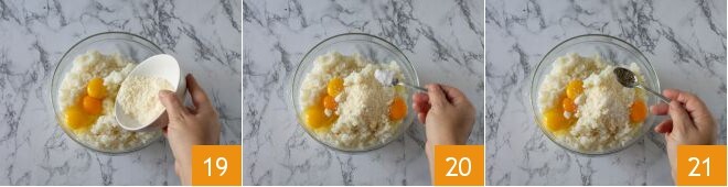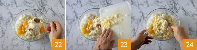 die Muskatnuss 22 und die Fontina-Würfel 23. Rühren Sie mit einem Löffel um 24,