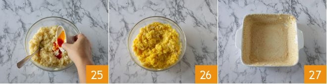 fügen Sie dann den im Wasser aufgelösten Safran hinzu 25 und rühren Sie erneut um 26. Fetten Sie eine 22x20 cm große Form ein und bestäuben Sie sie mit Semmelbröseln 27.