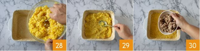 Geben Sie die Hälfte des Reises in die Auflaufform 28, glätten Sie die Oberfläche mit einem Löffel 29 und fügen Sie die gekochte Wurst hinzu 30.