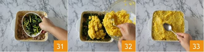 Verteilen Sie sie auf der gesamten Oberfläche, dann fügen Sie auch den Stängelkohl hinzu 31 und machen Sie dasselbe. Bedecken Sie mit dem restlichen Reis, glätten Sie die Oberfläche erneut 33