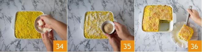 und garnieren Sie sie mit dem geriebenen Käse 34 und den Semmelbröseln 35. Backen Sie im vorgeheizten statischen Ofen bei 200° für 30 Minuten. Dann nehmen Sie ihn aus dem Ofen und lassen ihn leicht abkühlen, bevor Sie ihn servieren 36.
