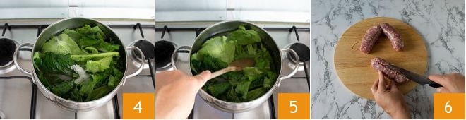 Geben Sie den Stängelkohl in einen Topf, fügen Sie Wasser hinzu, bis er bedeckt ist, und salzen Sie 4. Rühren Sie um und kochen Sie ihn etwa 10-15 Minuten 5. In der Zwischenzeit kümmern Sie sich um die Wurst, schneiden Sie sie der Länge nach ein und entfernen Sie die Pelle 6.