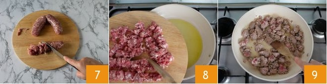 Schneiden Sie dann die Wurst mit einem Messer in Stücke 7. Erhitzen Sie ein wenig Öl in einem Topf, fügen Sie die Wurst hinzu 8 und braten Sie sie etwa 5 Minuten an 9.
