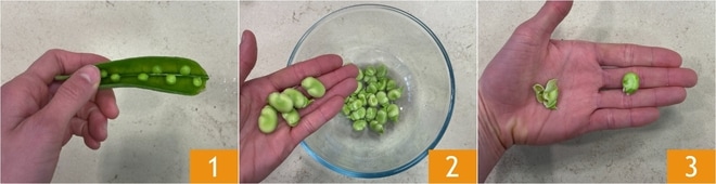 Um das Reisomelett zuzubereiten, bereiten Sie zuerst das Gemüse vor: Schälen Sie die Erbsen 1 und sammeln Sie etwa 80 g in einer Schüssel, dann machen Sie dasselbe mit den Saubohnen 2 und entfernen Sie die Haut 3; Sie benötigen etwa 50 g geschälte Saubohnen.