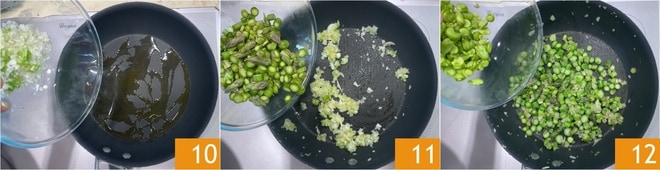 Erhitzen Sie etwas Öl in einer großen Pfanne, fügen Sie den Frühlingszwiebel hinzu 10 und braten Sie ihn bei mittlerer Hitze für 2 Minuten an. Fügen Sie den Spargel 11 und die Saubohnen 12 hinzu und braten Sie sie für weitere zwei Minuten an.