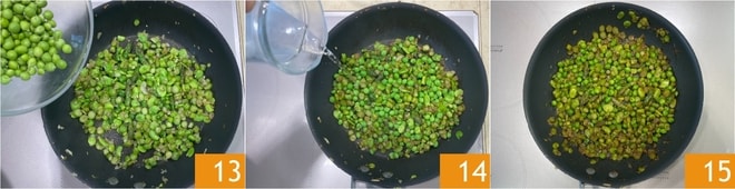 Fügen Sie auch die Erbsen hinzu 13, salzen Sie und braten Sie alles weitere 2 Minuten an, dann geben Sie eine Fingerbreit Wasser hinzu 14, reduzieren Sie die Hitze und kochen Sie mit Deckel für 5-7 Minuten. Schalten Sie die Hitze ab und lassen Sie es abkühlen 15.