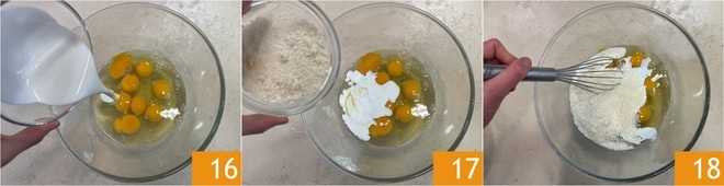 Schlagen Sie die Eier in einer Schüssel auf, dann fügen Sie die Sahne hinzu 16 und den geriebenen Grana Padano DOP 17 und vermischen Sie alles gut mit einem Schneebesen 18.