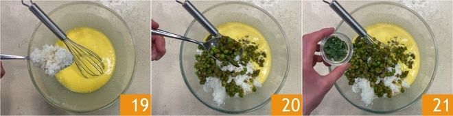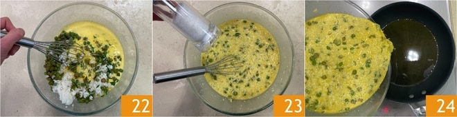Alles mit dem Schneebesen mischen 22, dann salzen 23 und pfeffern. Nehmen Sie eine Pfanne mit hohem Rand (wir haben eine mit einem Durchmesser von 19 cm am Boden verwendet), erhitzen Sie reichlich Öl und geben Sie die Mischung hinein 24.