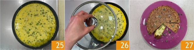 Mit dem Deckel abdecken und bei mittlerer bis niedriger Hitze etwa 35 Minuten kochen 25, dann das Omelett umdrehen und die andere Seite weitere 6 Minuten kochen, ebenfalls mit dem Deckel 26. Das Reisomelett auf eine Servierplatte geben und servieren 27!