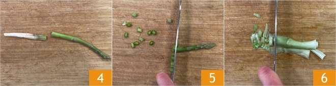 Entfernen Sie den holzigeren Teil des Spargelstängels 4 und schneiden Sie den Rest in Scheiben 5. Zuletzt den Frühlingszwiebel putzen und fein schneiden 6.