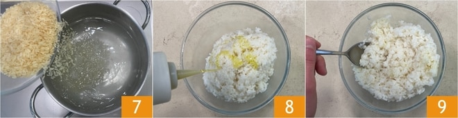 In der Zwischenzeit bringen Sie einen Topf mit gesalzenem Wasser zum Kochen und kochen Sie den Reis für die auf der Packung angegebene Zeit 7. Den Reis abgießen und in eine Schüssel geben, mit einem Schuss Öl würzen 8 und gut mischen 9. Beiseite stellen.