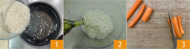 Um den Reissalat mit Gemüse und Erdnüssen zuzubereiten, kochen Sie zunächst den Reis in kochendem Salzwasser etwa 10 Minuten lang 1. Nach dieser Zeit den Reis abgießen und unter fließendem Wasser abkühlen, dann in eine Schüssel geben, mit etwas Öl anmachen 2 und abkühlen lassen. In der Zwischenzeit das Gemüse vorbereiten: die Karotten schälen und in Julienne schneiden 3.