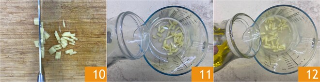 Schließlich den Ingwer schälen und in Stücke schneiden 10. Den Ingwer in einen Mixbecher geben, dann den Limettensaft 11 und das Öl hinzufügen 12.