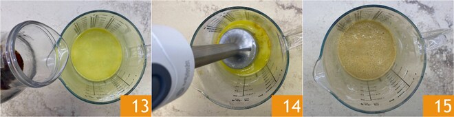 Mit einem Stabmixer pürieren, dann die Sojasauce hinzufügen 13 und nochmals pürieren 14, bis eine glatte und homogene Sauce entsteht 15.