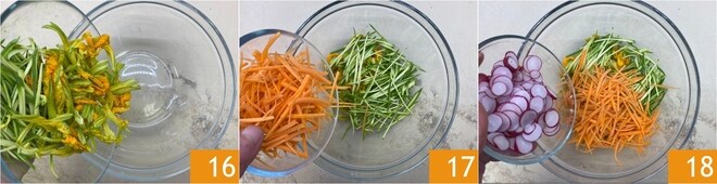 Jetzt alles Gemüse in eine große Schüssel geben: die Zucchini mit ihren Blüten 16, die Karotten 17 und die Radieschen 18.