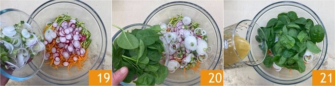 Auch die Frühlingszwiebel 19 und den vorher gewaschenen und getrockneten Babyspinat hinzufügen 20, dann mit dem Dressing anmachen 21 und gut mischen.